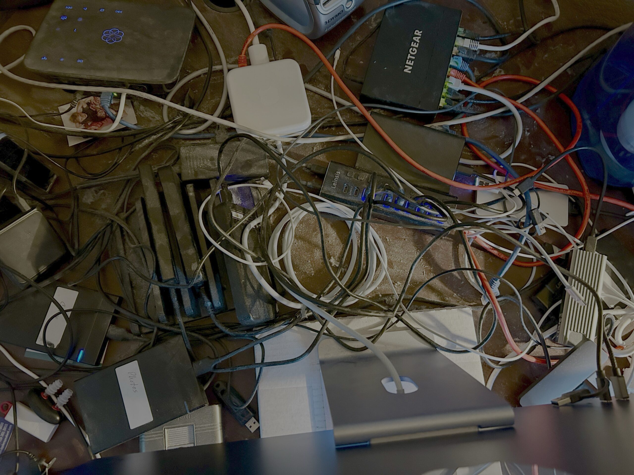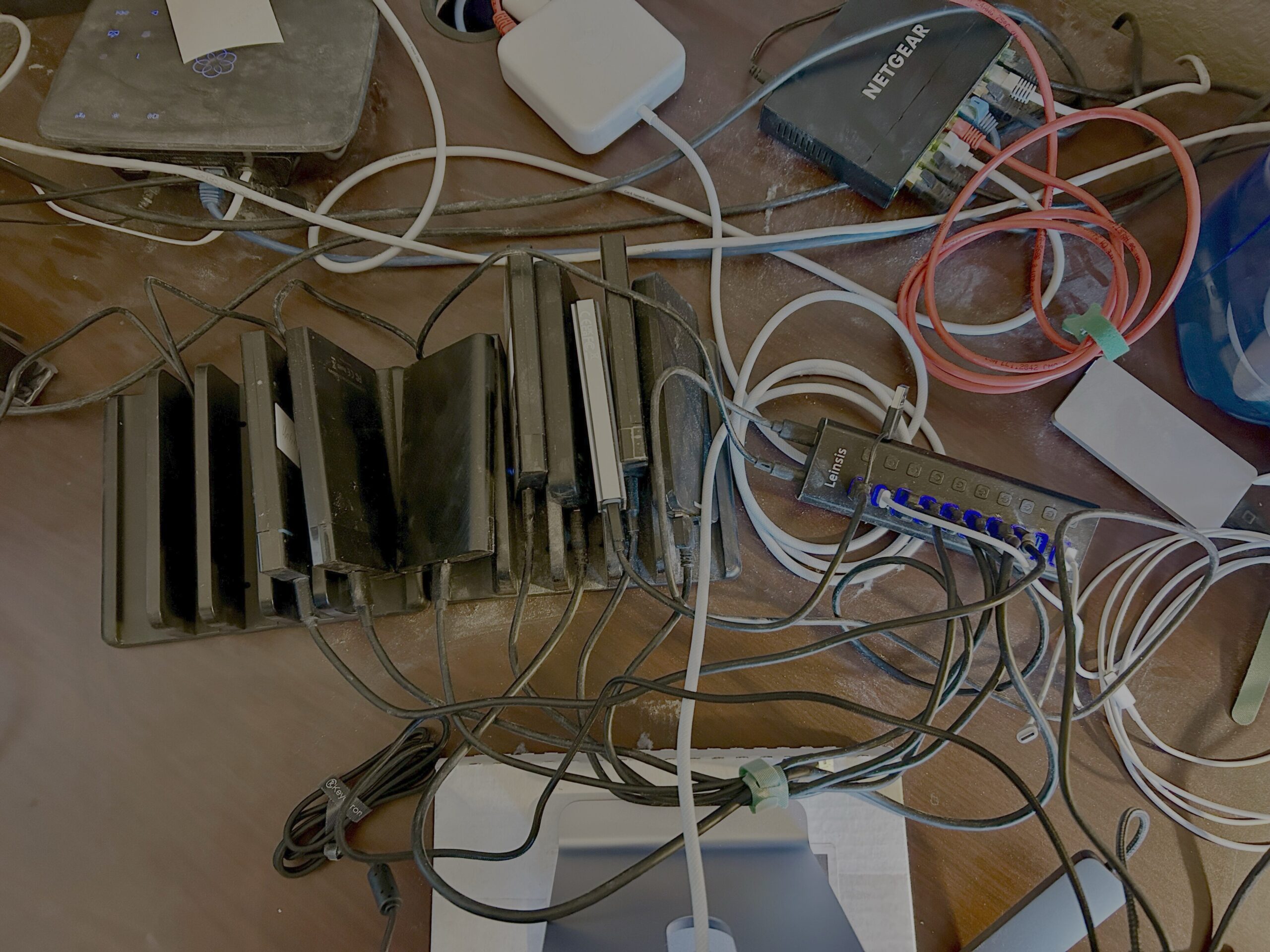 After doing some cleanup and junk removal, I used cable ties to connect like devices. All the hard drives are connected and sitting in hard drive trays. Several USB-A and USB-C cables are now joined with a Velcro cable tie. Some network cables were rearranged. This is what that area looks like now: