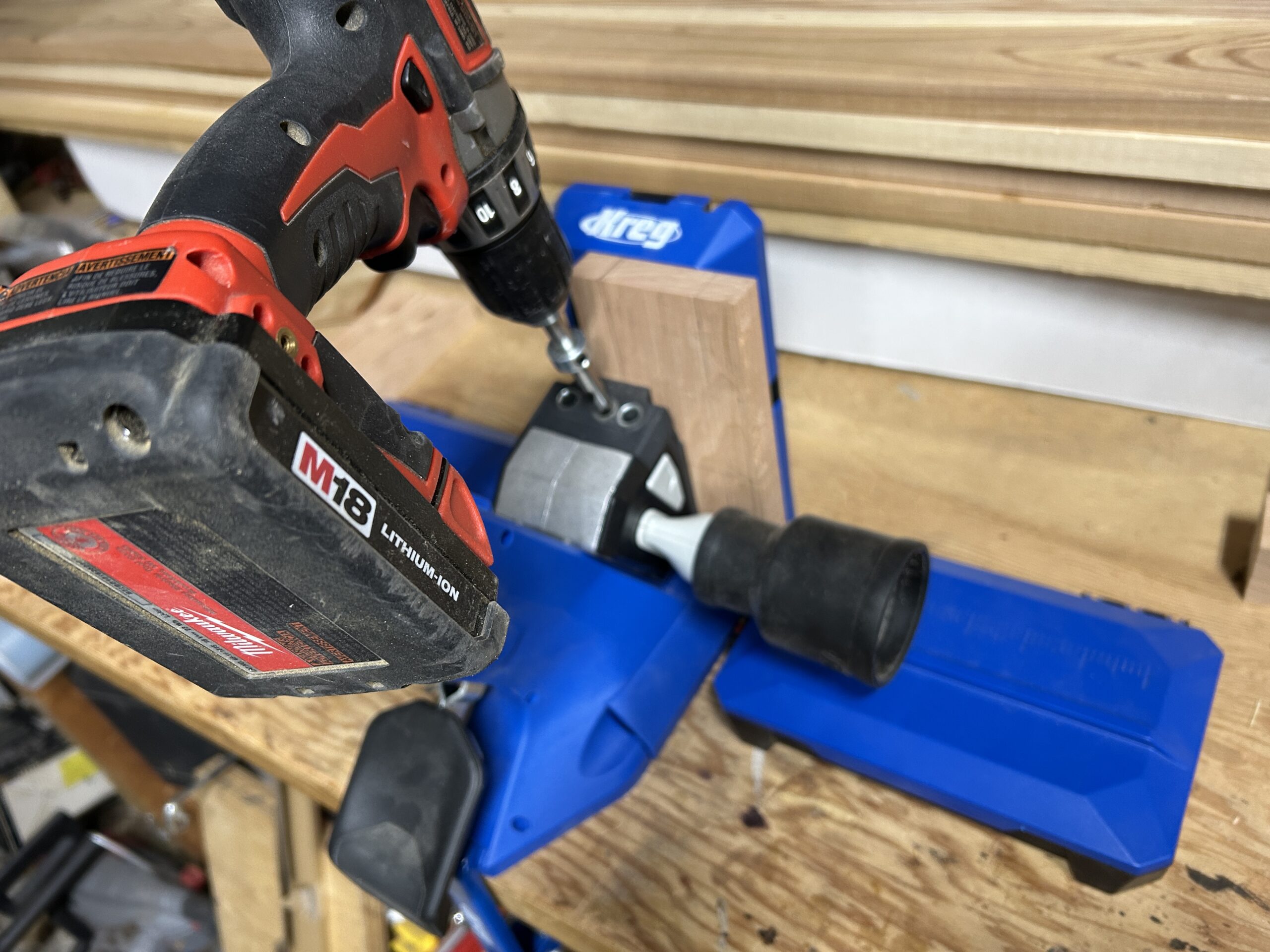 You place a board in the jig and drill holes into the board at an angle. Here is what it looks like with the drill inserted.