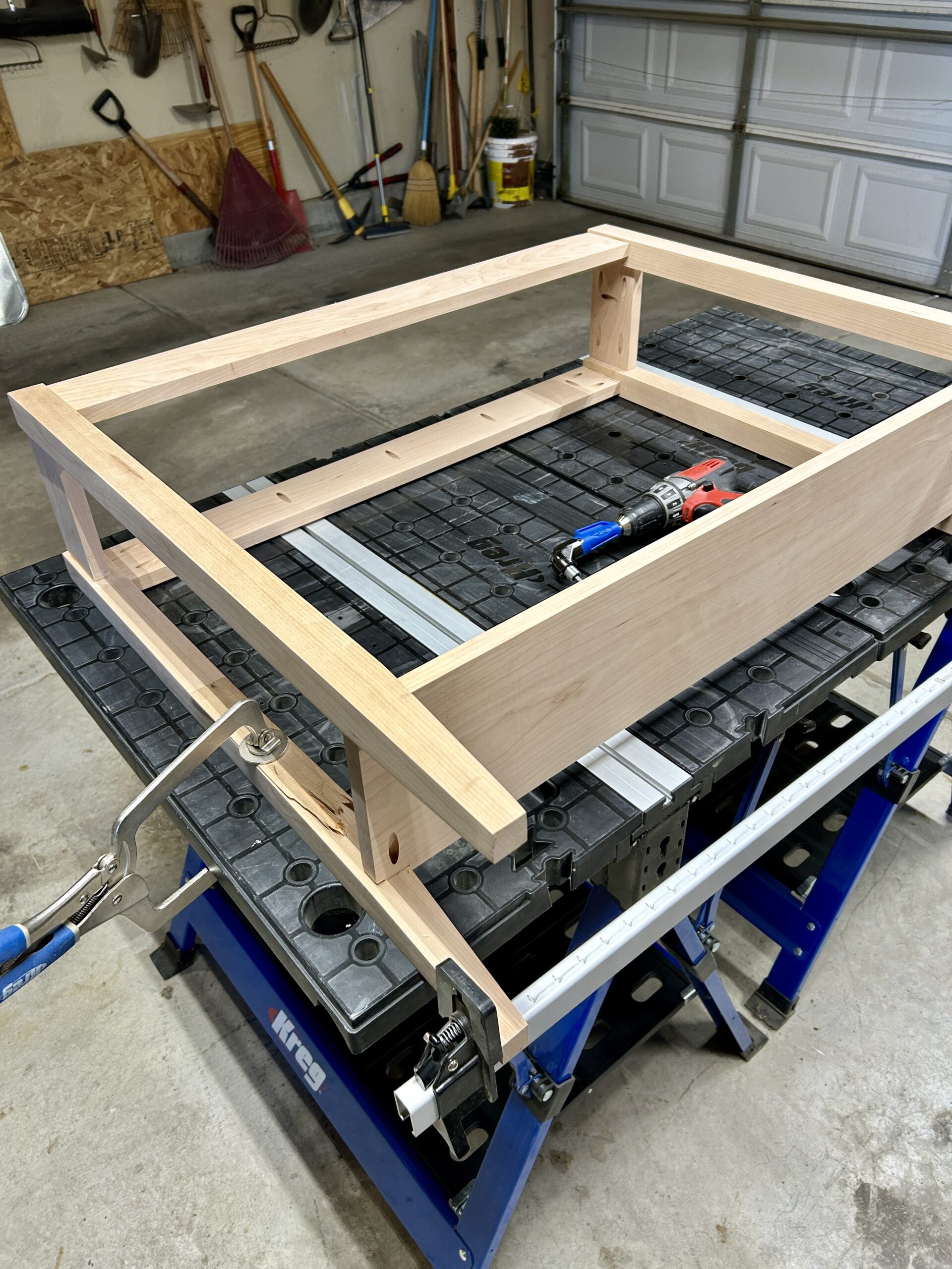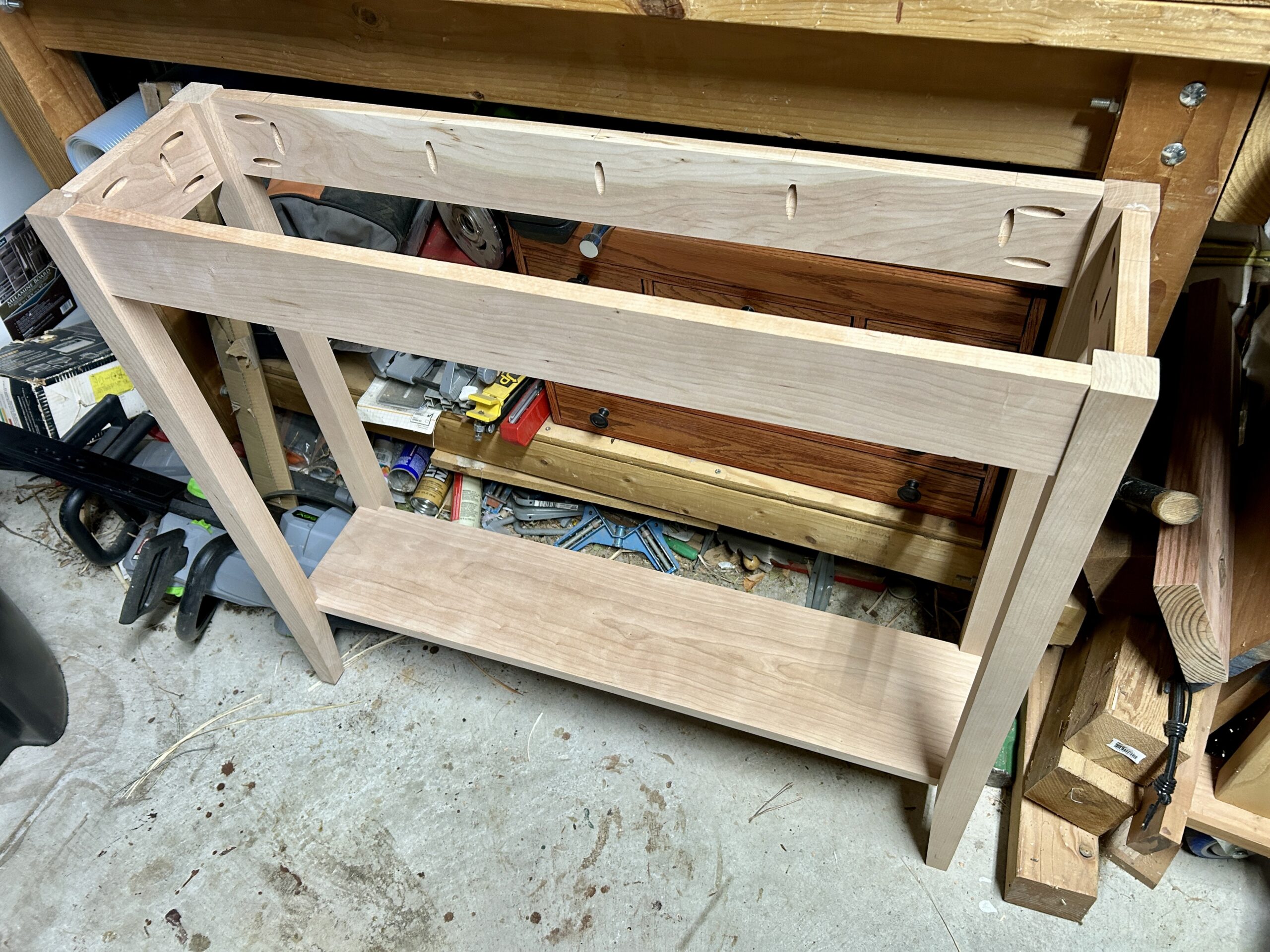 Believe it or not, I am still working on the Entry Table. It is slow-going, my knee has been bothering me quite a bit. I made the bottom shelf a couple of weeks ago, but just now got around to installing it. Here is a bit of the process.