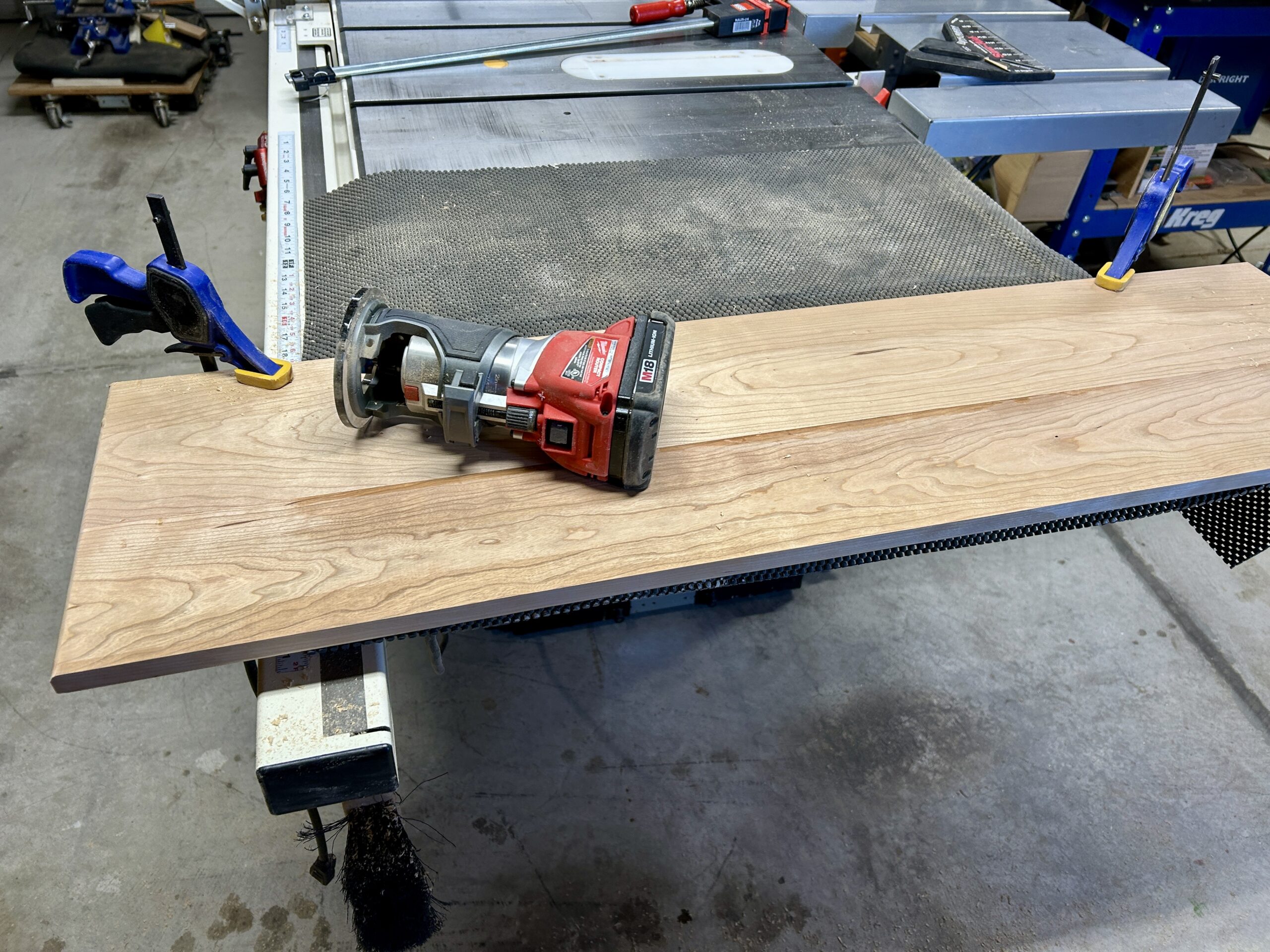 I worked on finishing the End Table Top today. I used my new cordless Milwaukee palm router to put a round over edge on the top. It is a really nice palm router. It is enjoyable to not have to deal with a corded tool. Here is what some preparation looks like.